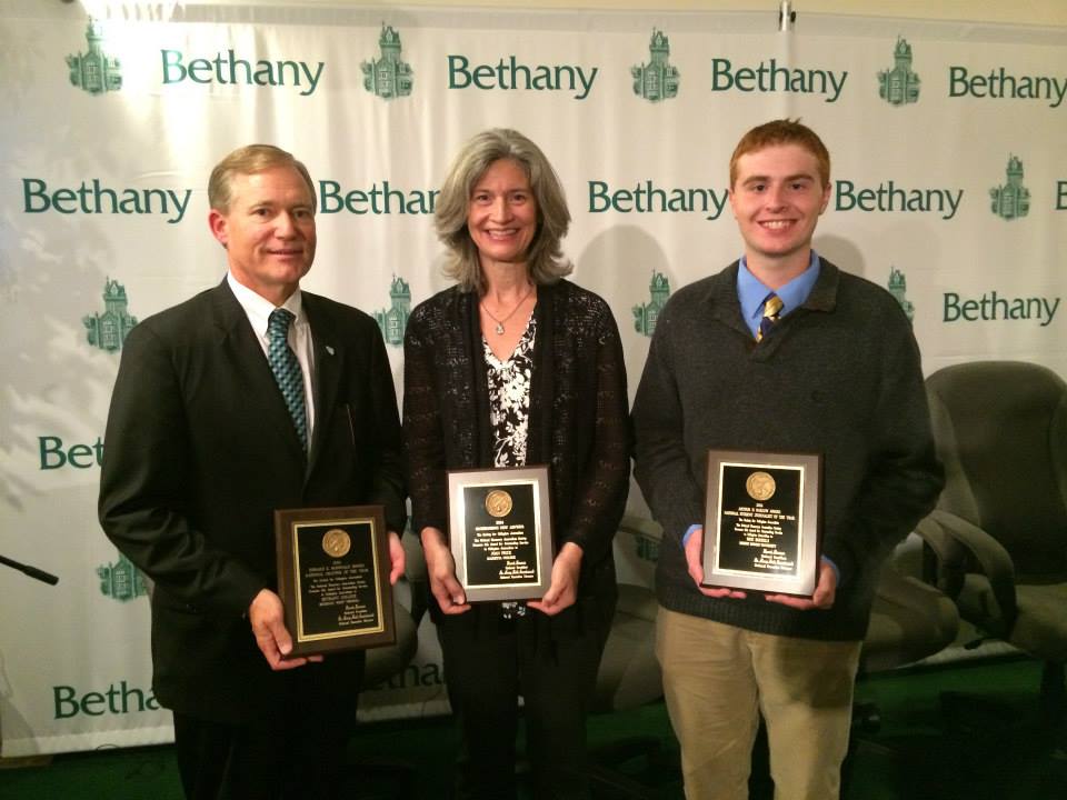 Major award winners: Dr. Scott D. Miller, president of Bethany College, accepts the award for Outstanding Chapter (Bethany College); Dr. Joan Price, Marietta College, for Outstanding New Adviser, and Nick Buzzelli, for Student Journalist of the Year. Awards were presented at the 2014 SCJ Biennial Conference at Bethany College, West Virginia.