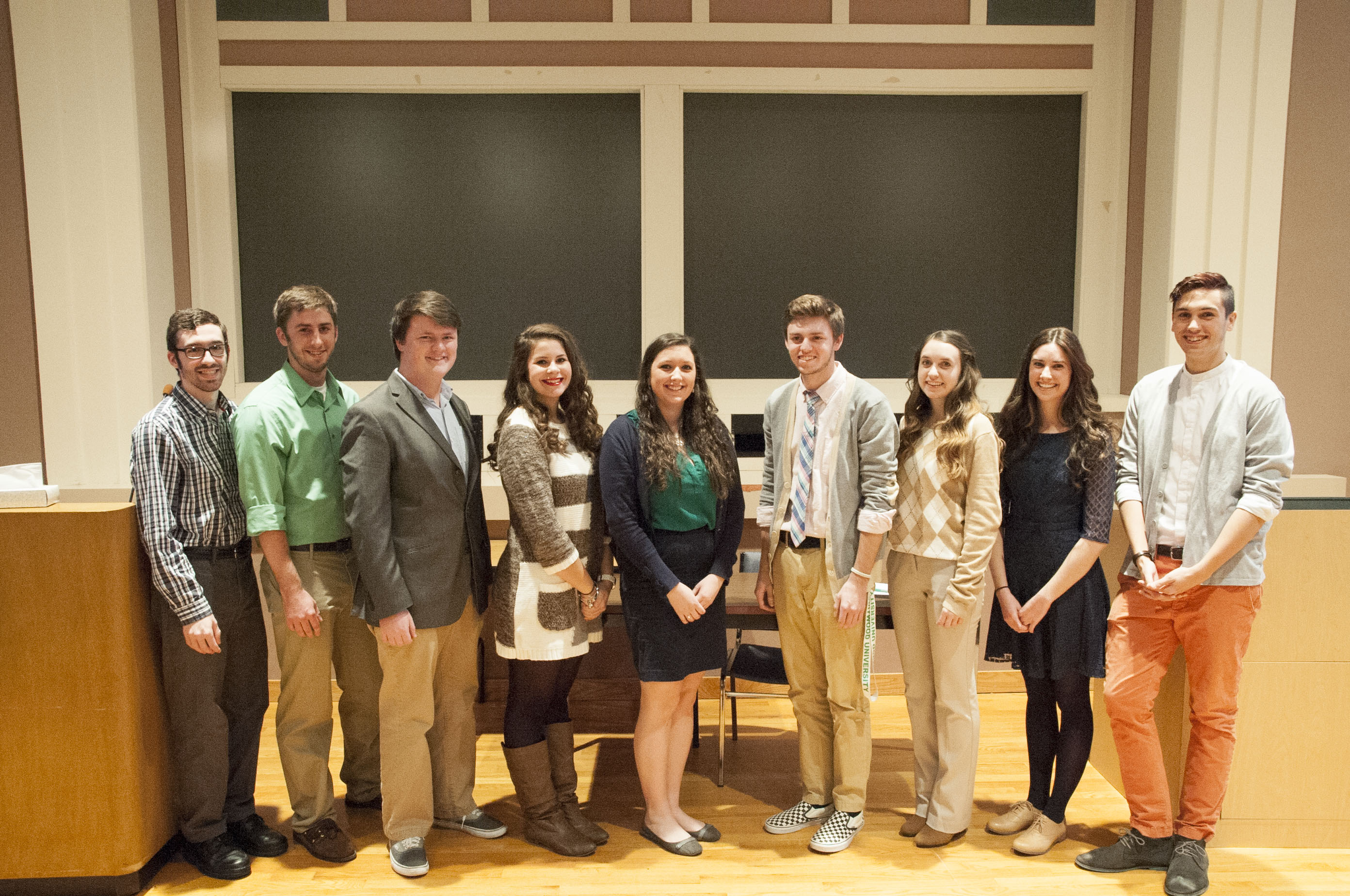 Group shot of new Marywood University SCJ members. From left: Paul Capoccia, Cameron Dieck, Patrick Kernan, Esperanza Gutierrez, Haley O’Brien, Alex Weidner, Anne Zukowski, Juliette Meyers, and Brandon Melo. (Absent from photo: Sophie Pauline) Photo credit: Paul Sevensky