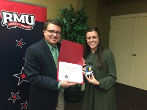 img_7735 Published October 17, 2016 at 3264 × 2448 in RMU initiates, celebrates new and returning members ← Previous Delaney Hassell receives her Medal of Merit award from chatper adviser Anthony Moretti.