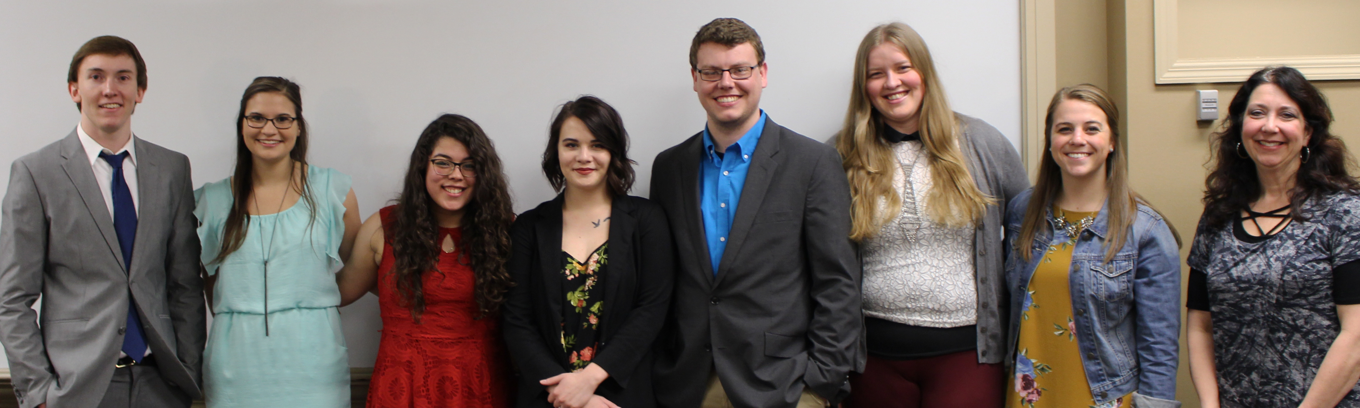 2016-17 BVU SCJ Outgoing Board (L to R): Morgan McGrew (President); Lindsey Graham (Treasurer); Jasmine Bautista (Service Coordinator); Dee Friesen (Service Coordinator); Spencer Bottorff, (Vice President); Emily Johnson (Vice President); Kassi Kommes (Secretary); Dr. Andrea Frantz, (Adviser)