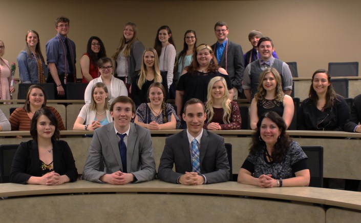 First Row (L to R): Dee Friesen, Vice President/Service Coordinator; Morgan McGrew, President; Kyle Wiebers, Treasurer; Dr. Andrea Frantz, Faculty Adviser (not pictured, Madeleine McCormick, Secretary/Social Media] Second Row (L to R) New Members: Job Saunders, Tawney Schreier, Emily Kenny, Katelyn Bohaty, Olivia Wieseler, Allyssa Ertz, Megan Snyder, Alyssa Donnelly, Tyler Brunner, Andrew Bandstra Third Row (L to R): Tiffany Brauckman, Kylee Deering, Sarah Nicholson, Cooper Maahs (not pictured: Tanner Hoops, Brittany Poeppe, Mackenzie Rappe) Fourth Row (L to R): Graduating Seniors with cords: Chase Harrison, Susie Haack, Kassi Kommes, Chris Haberman, Jasmine Bautista, Emily Johnson, Meredith VanZuiden, Lindsey Graham, Spencer Bottorff, Skyler Gorsett