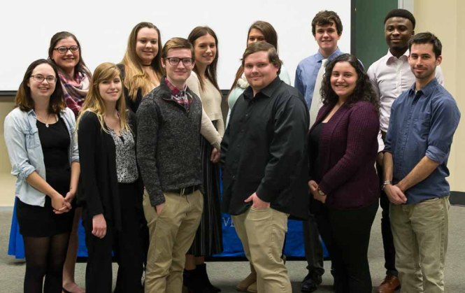 Members are Madison Antrim, Allyson Bane, Mercury Bowen, Jordan Boyer, JJ Bullock, Meghan Cebula, AJ Fournier, Jada Huddlestun, Melissa Jabek, Travis Moody, Thomas O’Connor, Jaynell Perera, Colin Roberts, Brooke Schwartz and Toluwalase Solomon. Photo by SCJ chapter adviser Brian Poulter.